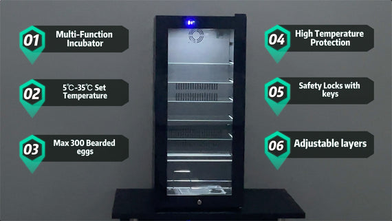 The reptile incubator has a capacity of 93 liters and can accommodate approximately 300 bearded dragon eggs.